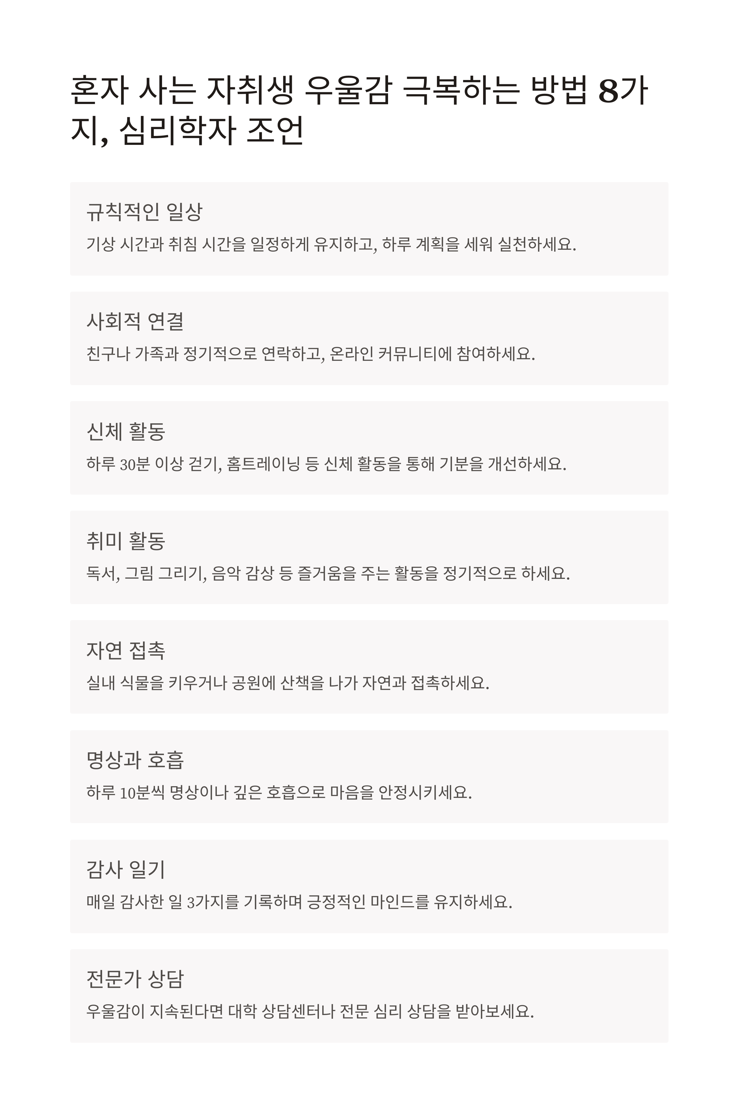오늘은 심리상담사로서의 전문 지식과 5년차 자취생으로서의 경험을 바탕으로 혼자 살아도 외롭지 않게, 우울감을 극복하는 실질적인 방법 8가지를 소개해 드리려고 합니다.